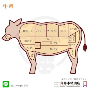 井本精肉店では全ての部位を自店舗で捌いてお手元にお届けしています。「カルビ」とは「アバラ」を指す言葉で、韓国語の「カルビッピョ(アバラ骨)」という言葉が語源となっています。カルビ肉は「バラ肉(アバラ周辺の肉)」のことで、韓国では特に骨付きのアバラ肉のことを指します。日本でカルビといえば牛肉を指すことがほとんどですが、韓国では豚肉や鶏肉にもカルビという言葉が使われるようです。カルビは赤身と脂が層になっているのが特徴で、赤身、脂、皮を総称して三枚肉とも呼ばれます。