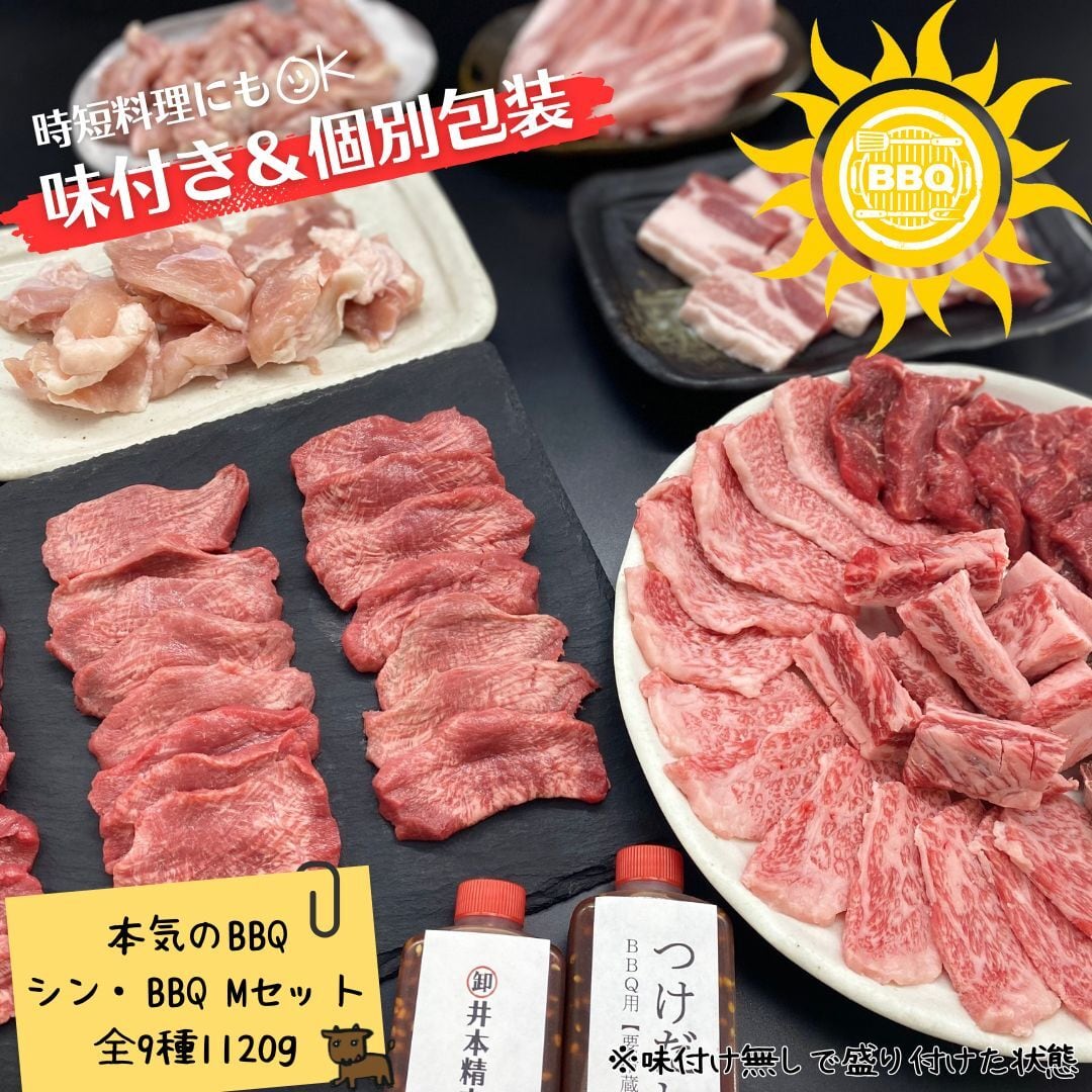 ★おつまみタン1個付き&送料無料ver.★【シン・味付きBBQ/Mセット】<全9種1120g>「個別包装」牛タン付きの肉屋特製BBQセット(A5黒毛和牛カブリ、黒毛和牛&国産牛切り落とし、国産牛ロース、牛ハラミ、牛タン、豚カルビ、豚トロ、鶏モモ、せせり)特製タレ付き ※袋真空パックでお届けします